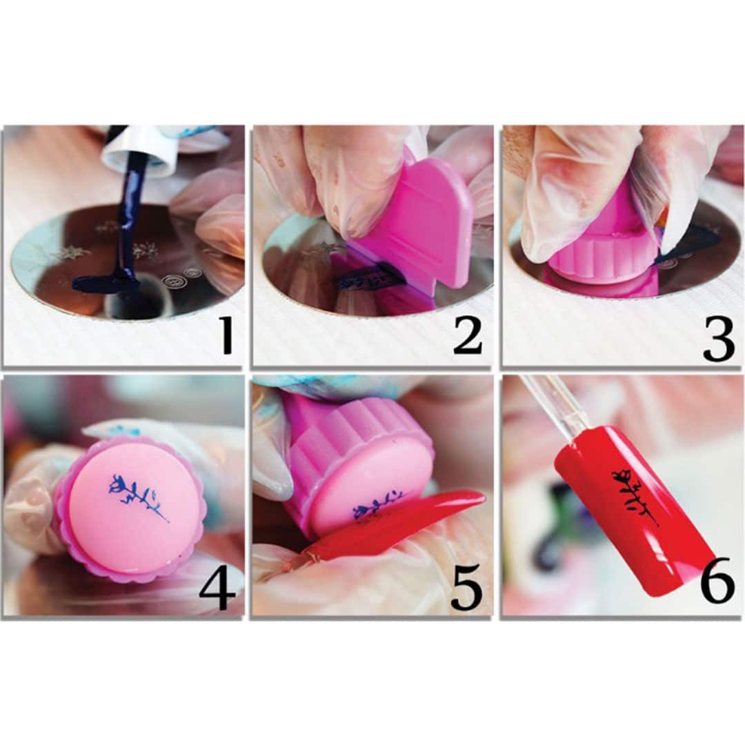 - Labai efektyviai, geriausia ant plokštelės su raštu pridėti silikoninį antspaudą ir iš karto užtepti visą ant pasirinkto nago.