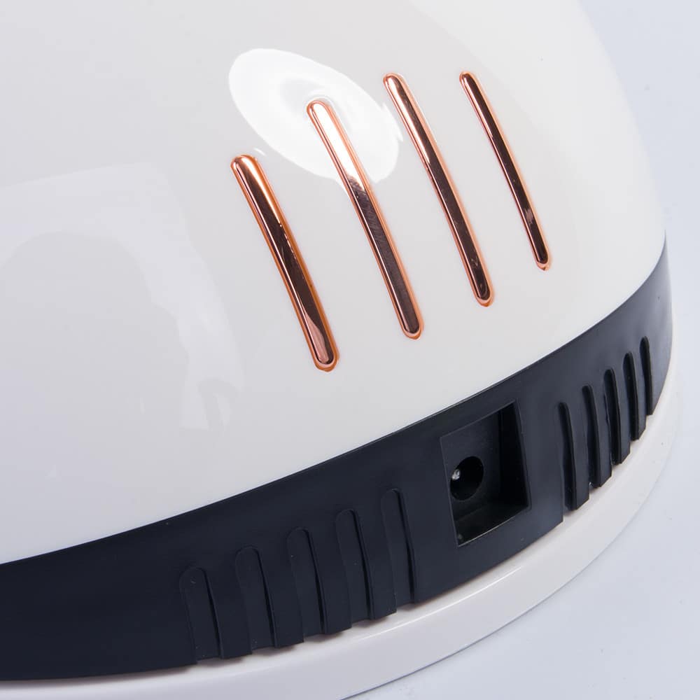 Pateicoties dubultajai LED tehnoloģijai, lampa droši, cieti un vienmērīgi nostiprina visas hibrīda lakas un želejas. Spuldzes izstaro baltu gaismu, kas nenoslogo acis. Lampas dizains un lampu izvietojums uzlabo gaismas izplatību un lieliski izžāvē gan naga augšdaļu, gan nagu galus un sānus.